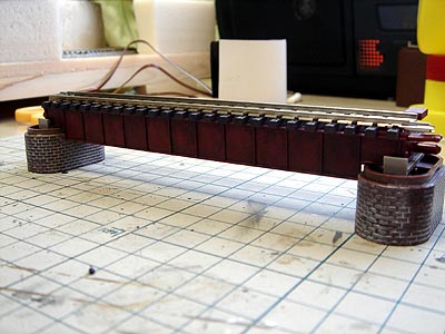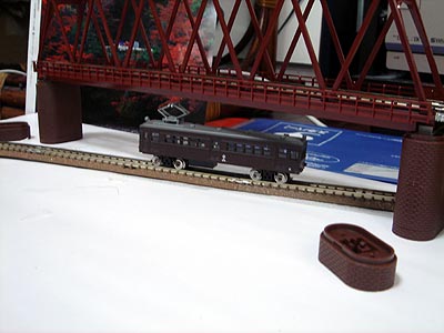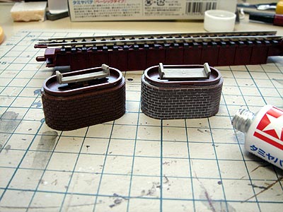 まず先行購入したガーダー橋におめかし。「鉄道模型入門」って言う参考書に乗っていた方法で橋脚部のレンガ積みにメリハリを付けてみました。パテを塗って拭き取っただけです。