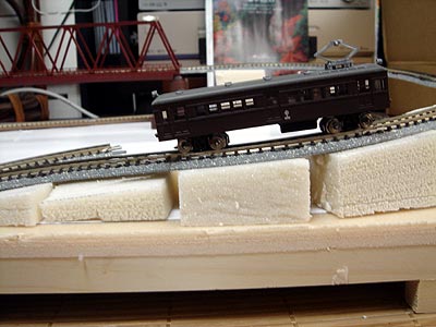 急勾配の走行確認を行います。テスト車両は「昭和の鉄道模型をつくる」に付いてきた車両と動力ユニットです。
